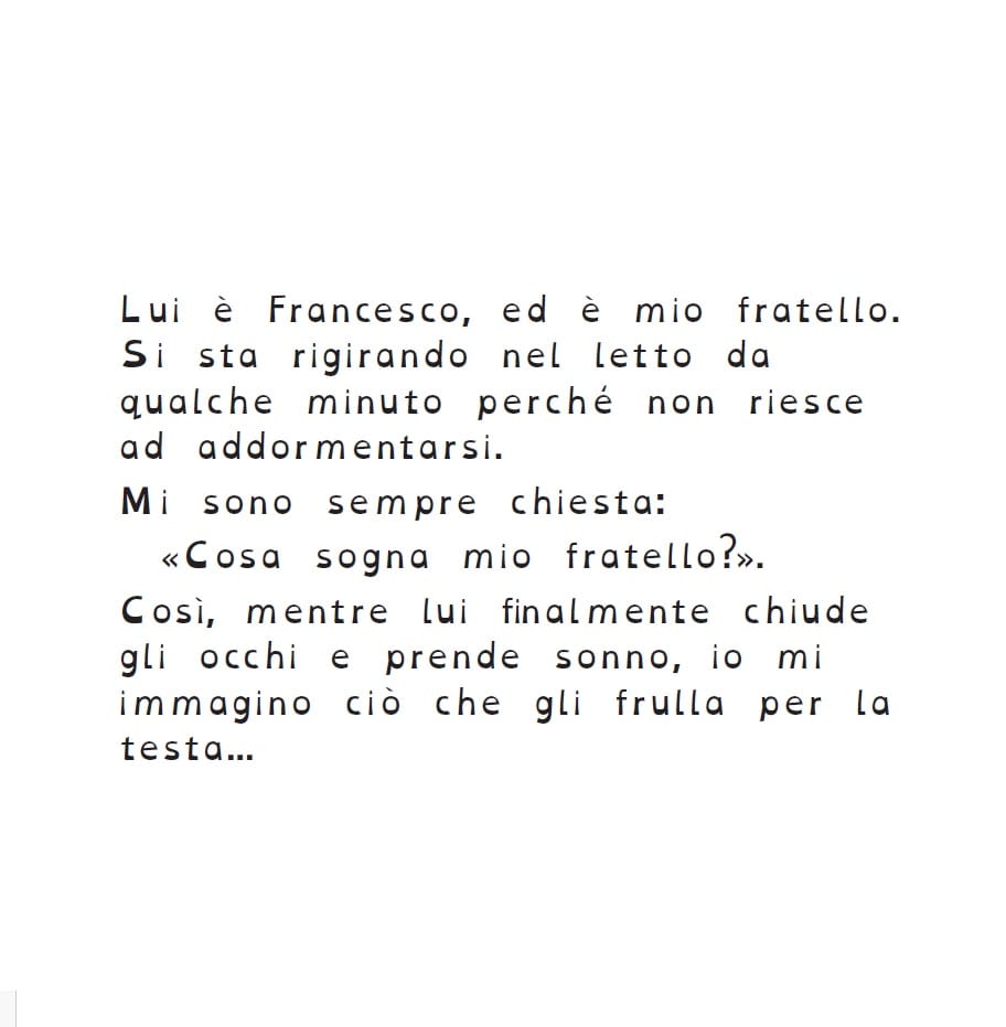 Ho scritto questo libro per celebrare mio fratello con gli strumenti che conosco meglio: il disegno e la narrazione. Perché Francesco, come dice la mia psicologa, è “un essere perfetto”: la relazione con lui è limpida e semplice. Ad ogni gesto risponde con la reazione più genuina e umana possibile: “sono triste – ti consolo”, “sono felice – ridi con me”. Non ci sono inganni o sovrastrutture, solo verità. Leggere questo libro significa entrare in quel mondo genuino, fatto di sogni e di spontaneità, e lasciarsi toccare dalla sua magia.
