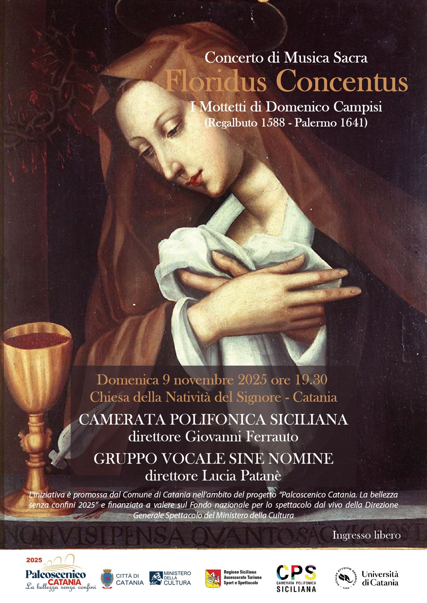 La Camerata Polifonica Siciliana diretta dal M° Giovanni Ferrauto domenica 9 novembre alle ore 19.30 sarà protagonista, insieme al gruppo vocale “Sine Nomine” diretto da Lucia Patané, del concerto di musica sacra “Floridus Concertus” che si terrà nella Chiesa della Natività del Signore di Catania.