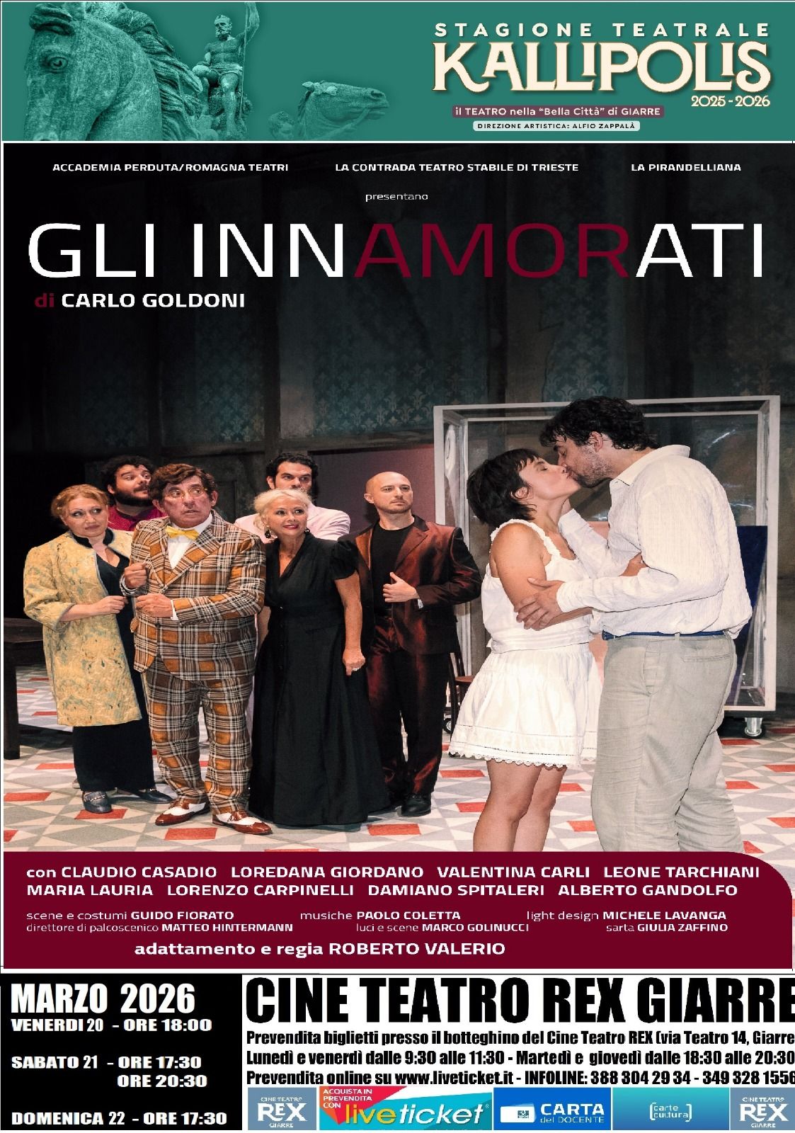 Prosegue con successo la stagione teatrale “Kallipolis” diretta da Alfio Zappalà, organizzata da ArchiDrama, con il patrocinio del Comune di Giarre. Lo storico e rinnovato Cine Teatro Rex di Giarre – da venerdì 20 marzo a domenica 22 marzo (venerdì pomeridiano ore 18.00; sabato pomeridiano ore 17.30 e serale ore 20:30; domenica pomeridiano ore 17.30) – accoglie lo spettacolo “Gli innamorati” di Carlo Goldoni con Claudio Casadio per la regia di Roberto Valerio che ha curato anche l’adattamento. “Specchiatevi, o giovani, in questi Innamorati ch’io vi presento;/ ridete di loro, e non fate che si abbia a rider di voi”. Con queste parole Goldoni introduce, sintetizzandone magnificamente il senso, la propria intramontabile commedia comico-brillante in tre atti (datata 1759).