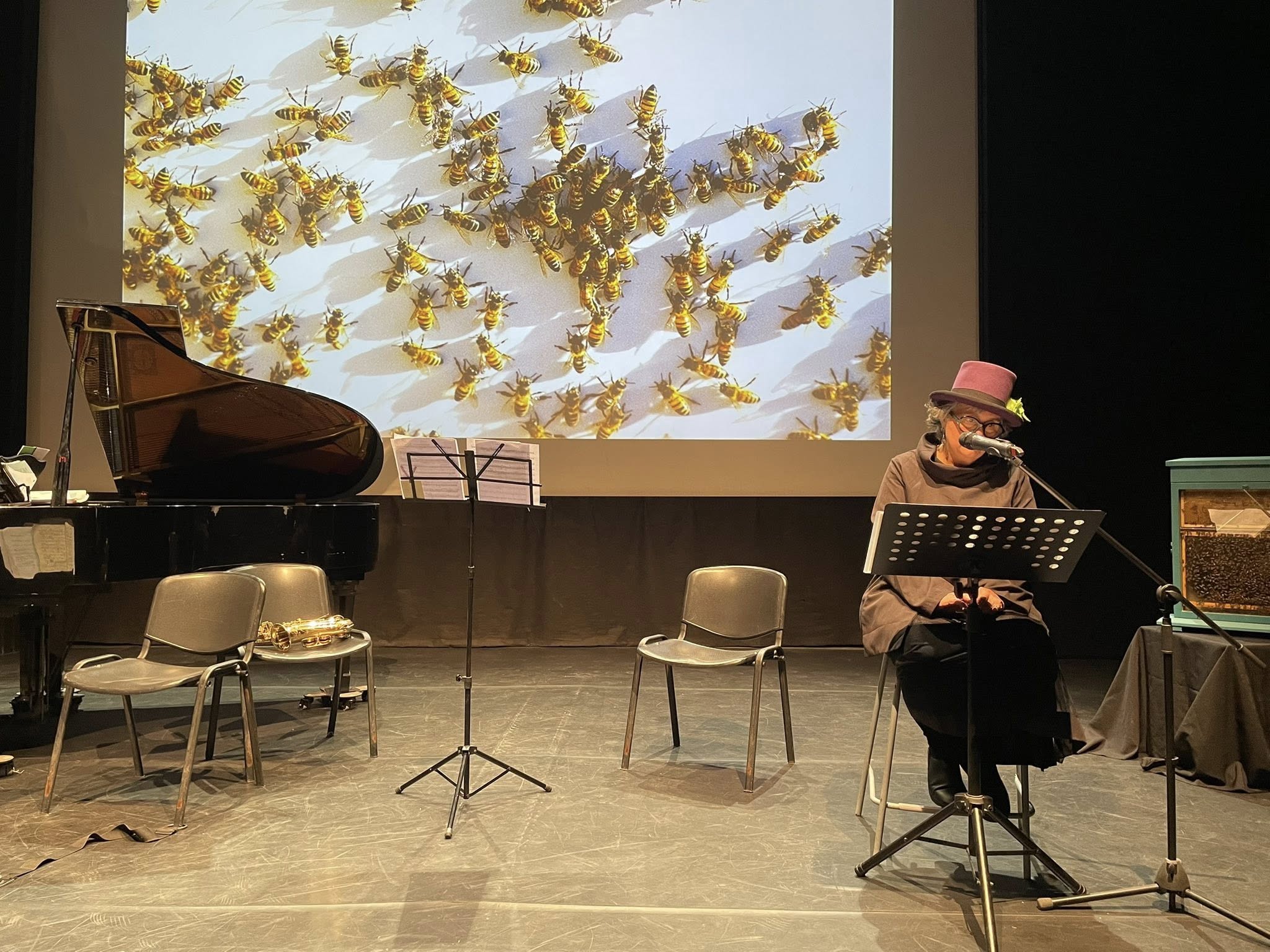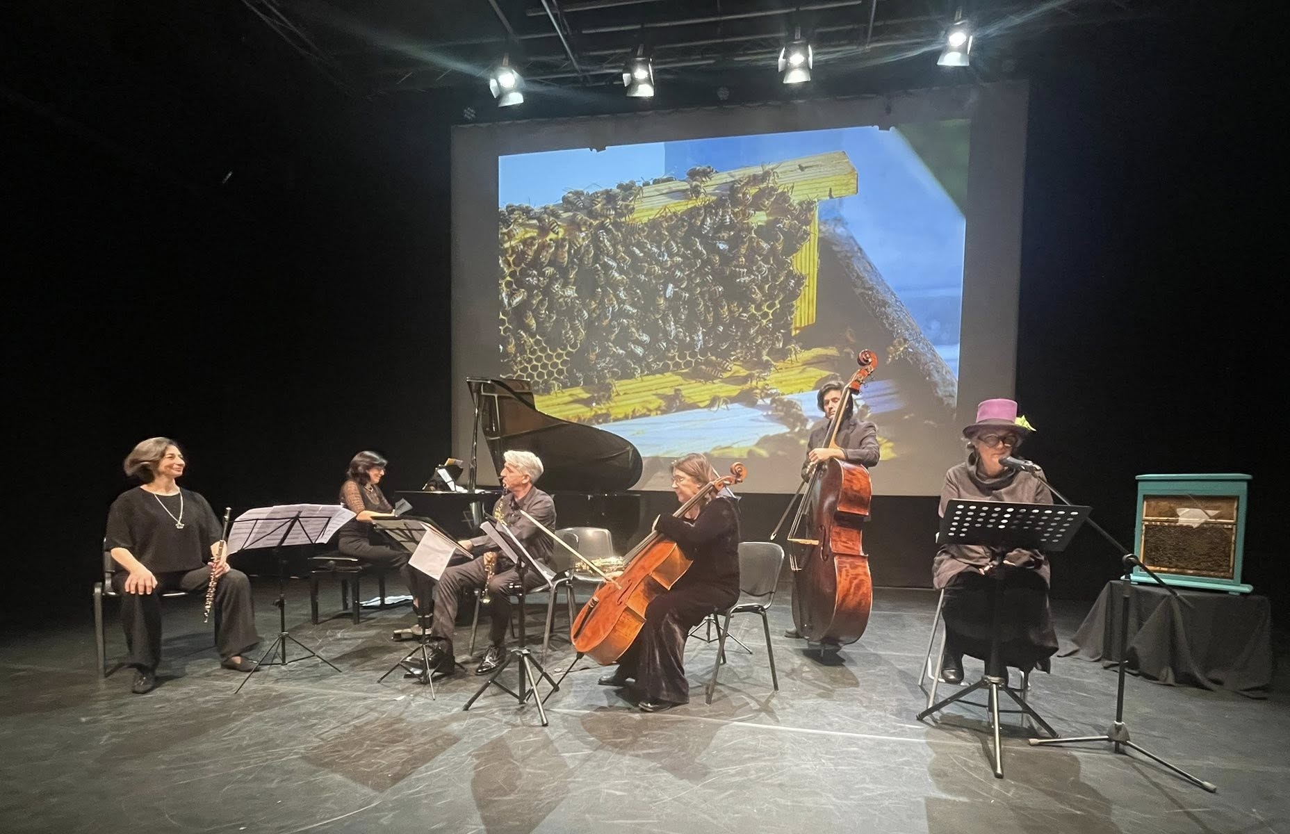 “ARNIE. per miele, musica e voce di poesia” è un duplice omaggio alla primavera e al meraviglioso mondo delle api. Lo spettacolo è ideato per un organico insolito, che ha “giocato” alternando performance a due, tre o cinque musicisti. Protagonista il “Balance Trio”, formatosi nel 2025 e composto da Gianfranco Brundo ai sassofoni, Francesca Taviani al violoncello e Ketty Teriaca al pianoforte, che è stato completato dalla presenza della flautista Giusy Ledda e del contrabbassista Carmelo La Manna. Il set è stato brillantemente arricchito dalle poesie recitate dalla scrittrice Lina Maria Ugolini, come dalle foto e dai video sulla vita delle api, realizzati da Giuseppe Lombardo.