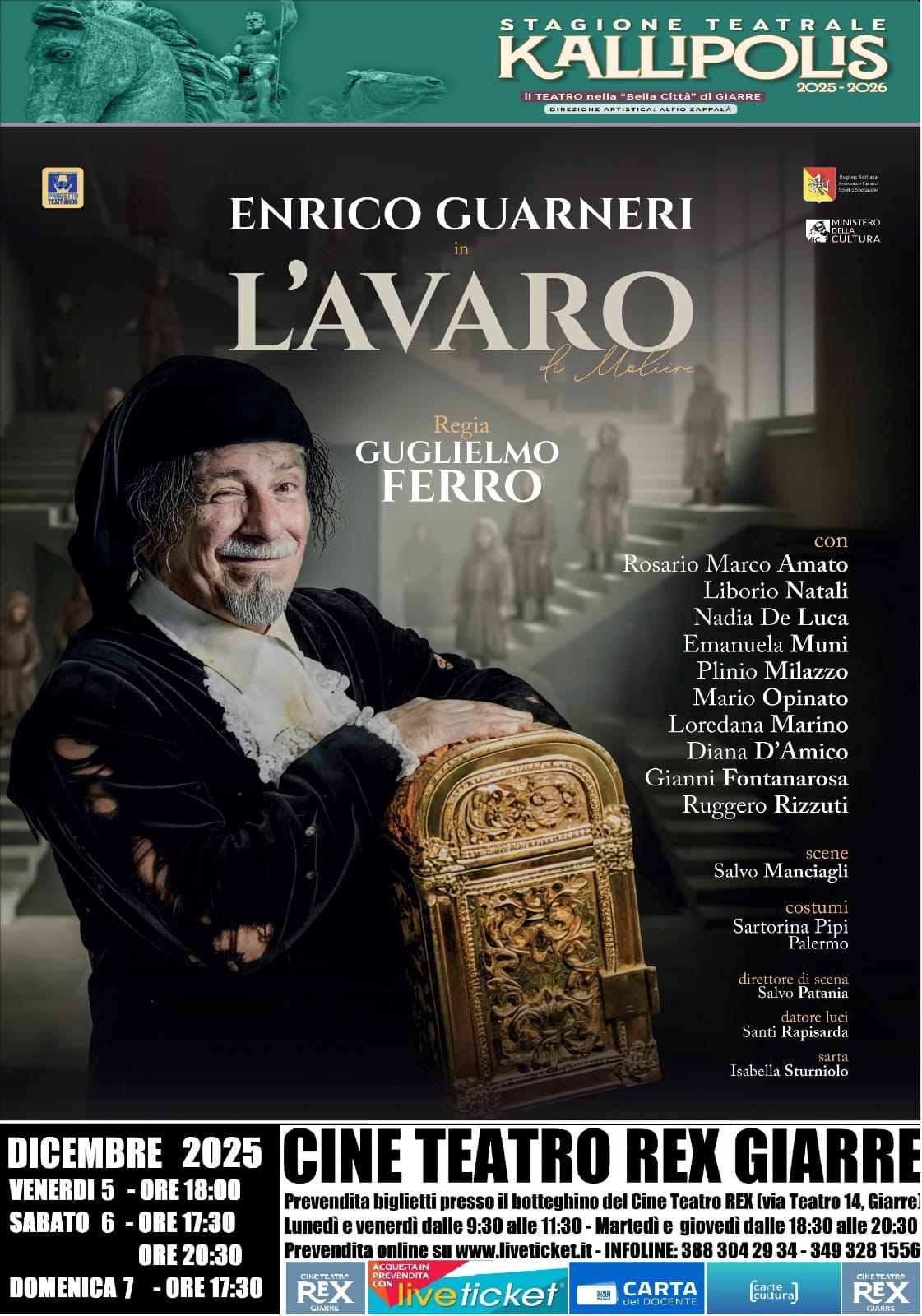 Attesa per l’intramontabile messinscena “L’Avaro”, intrepretata da Enrico Guarneri e diretta da Guglielmo Ferro, che sarà accolta dal Cine Teatro Rex di Giarre, venerdì 5 dicembre, alle ore 18:00 (repliche sabato 6 dicembre, ore 17:30 e 20:30; domenica 7 dicembre, ore 17:30). Portare in scena “L’Avaro” oggi significa attraversare con ironia tagliente e intelligenza teatrale un testo immortale, che racconta vizi e debolezze dell’animo umano con una lucidità ancora sorprendentemente attuale. L’opera di Molière, pur affondando le radici nel Seicento, continua a parlarci oggi con uno sguardo vivo, corrosivo, spietatamente comico.