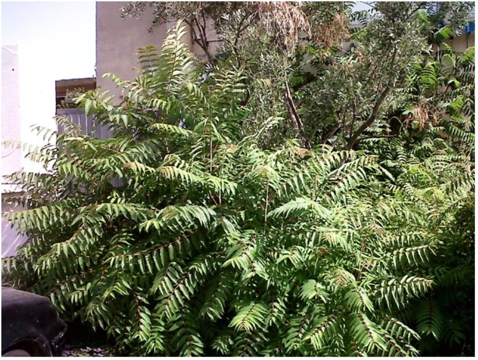 Ailanthus altissima, chiamato comunemente albero del cielo, albero del paradiso, albero del sole, ailanto della Cina, è un albero originario dell’Asia centromeridionale e dell’Australia e può raggiungere altezze poco superiori ai 25 m: molto ramificato, con numerosi polloni basali, fusto dritto, slanciato e regolare, corteccia grigio-brunastra con strette screpolate longitudinali più pallide, chioma elegante, largamente colonnare, sostenuta da rami ombrellati e foglie imparipennate. I fiori, riuniti in infiorescenze a pannocchia o a spiga, sono di colore bianco-giallo, bisessuali e unisessuali. Introdotto in Europa nel ‘700 come pianta da giardino, è sfuggito un po’ ovunque, dall’Inghilterra all’Europa mediterranea e nordica, agli Stati Uniti d’America. S’inselvatichisce facilmente, in particolare nelle zone periurbane, formando popolamenti densi che soppiantano la vegetazione indigena, infestando scarpate, incolti, bordi stradali, ruderi, macerie, muri abbandonati, stazioni e linee ferroviarie, aree industriali, margini forestali. La corteccia e le foglie possono provocare forti irritazioni cutanee e, nei paesi occidentali, generare ossessioni negli autoctoni.
