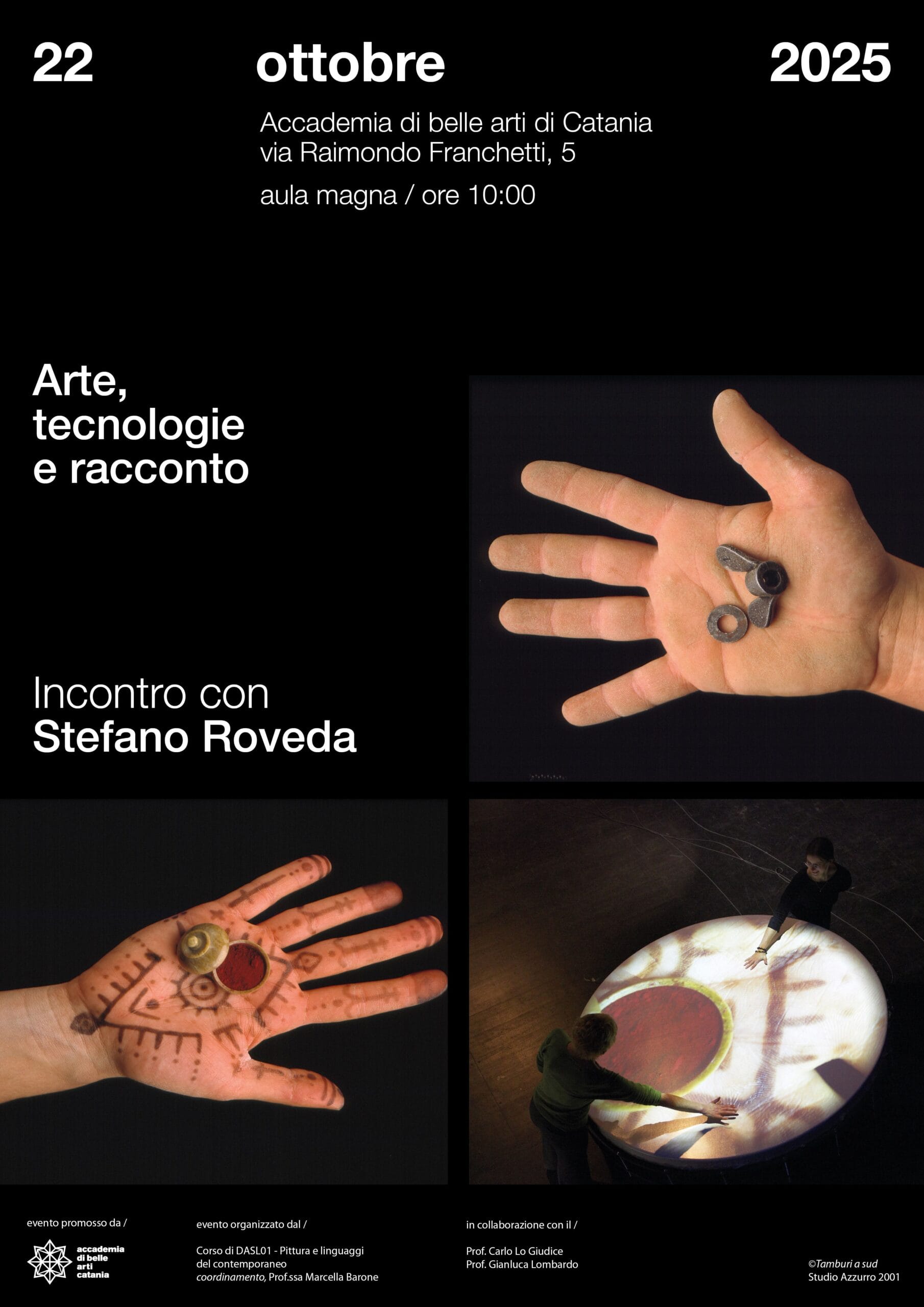 L’Accademia di Belle Arti di Catania organizza “Arte, tecnologie e racconto” un dialogo con Stefano Roveda, artista visivo, inventore e progettista di installazioni interattive per mostre e musei. L’incontro, a cura del corso di Pittura e Linguaggi del Contemporaneo, in collaborazione con il corso di Cinema, promosso e coordinato dalla Prof.ssa Marcella Barone in collaborazione con i Professori Carlo Lo Giudice e Gianluca Lombardo, rientra nella programmazione annuale di ricerca e formazione dedicata all’arte contemporanea. evento corso Pittura e linguaggi del contemporaneo e corso Cinema