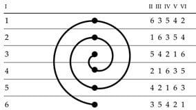 Si tratta di una sestina lirica, forse la forma di poesia più “matematica” della nostra letteratura. Se il sonetto fu inventato da Jacopo da Lentini sotto l’influsso di Fibonacci, la sestina appare con Arnaut Daniel e segue la regola della retrogradatio cruciata, che ricrea il movimento segreto della spirale attraverso lo schema ABCDEF, FAEBDC, CFDABE, ECBFAD, DEACFB, BDFECA, come rappresentato da questa immagine: