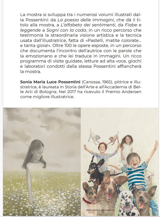 La mostra, ospitata nelle sale della Manica Lunga, sarà accompagnata per tutta la sua durata da un ricco programma di attività che comprende visite guidate per la scuola primaria e secondaria, letture ad alta voce, giochi e laboratori condotti dalla stessa Possentini.